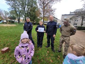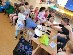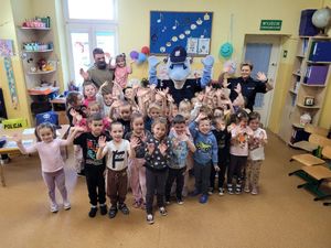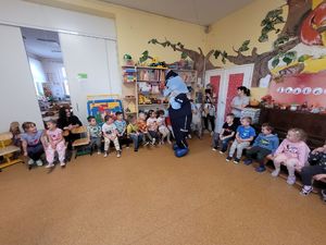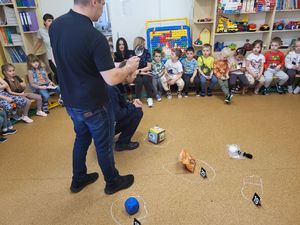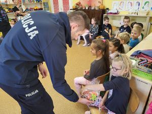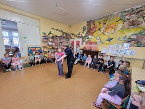 Technik kryminalistyki opowiedział o tym, na czym polega jego praca i pokazał jak zabezpiecza i utrwala ślady. Przedszkolaki chętnie robiły sobie odbitki palców. Dzieci zostały obdarowane kartami z zadaniami oraz kolorowankami. Były też upominki w postaci balonów.