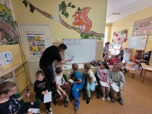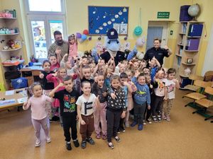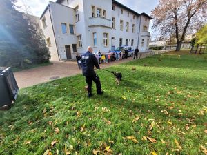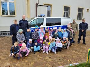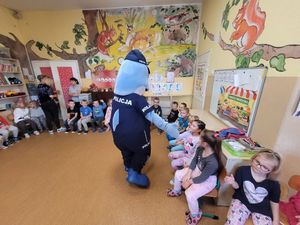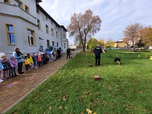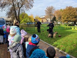 Dużą atrakcją była też wizyta policyjnej maskotki Polfinka oraz pokaz policyjnych przewodników z psami. Aportowanie, szukanie różnych przedmiotów utwierdziło przedszkolaki, że czworonogi są doskonale wyszkolone. Wspólne zdjęcia oraz podziękowania od dzieci dopełniły przebieg spotkania.