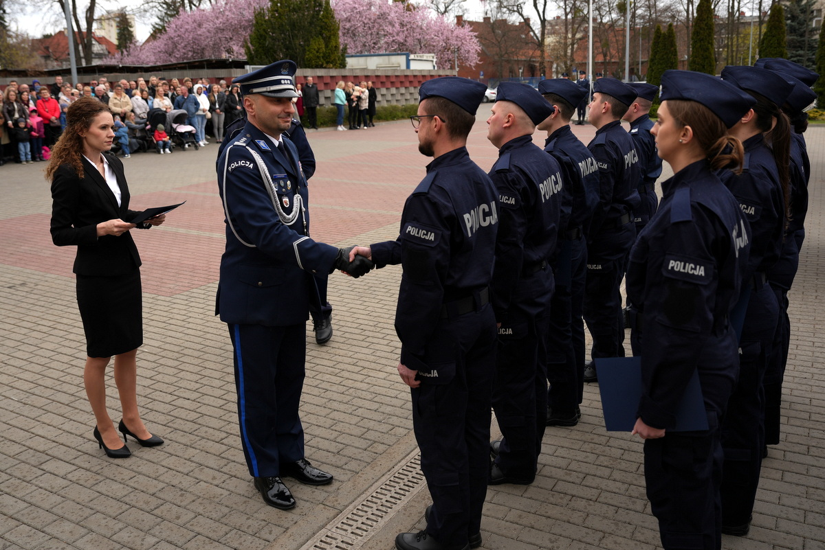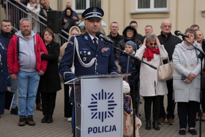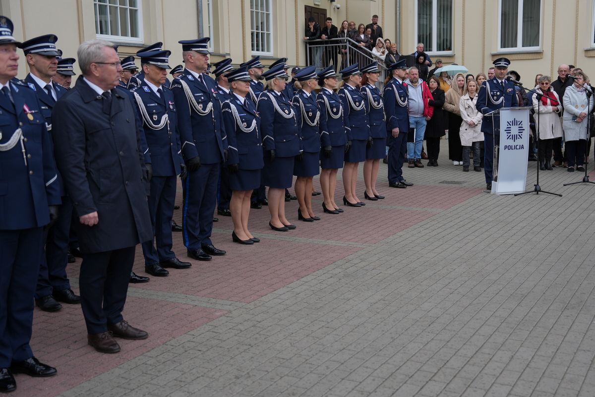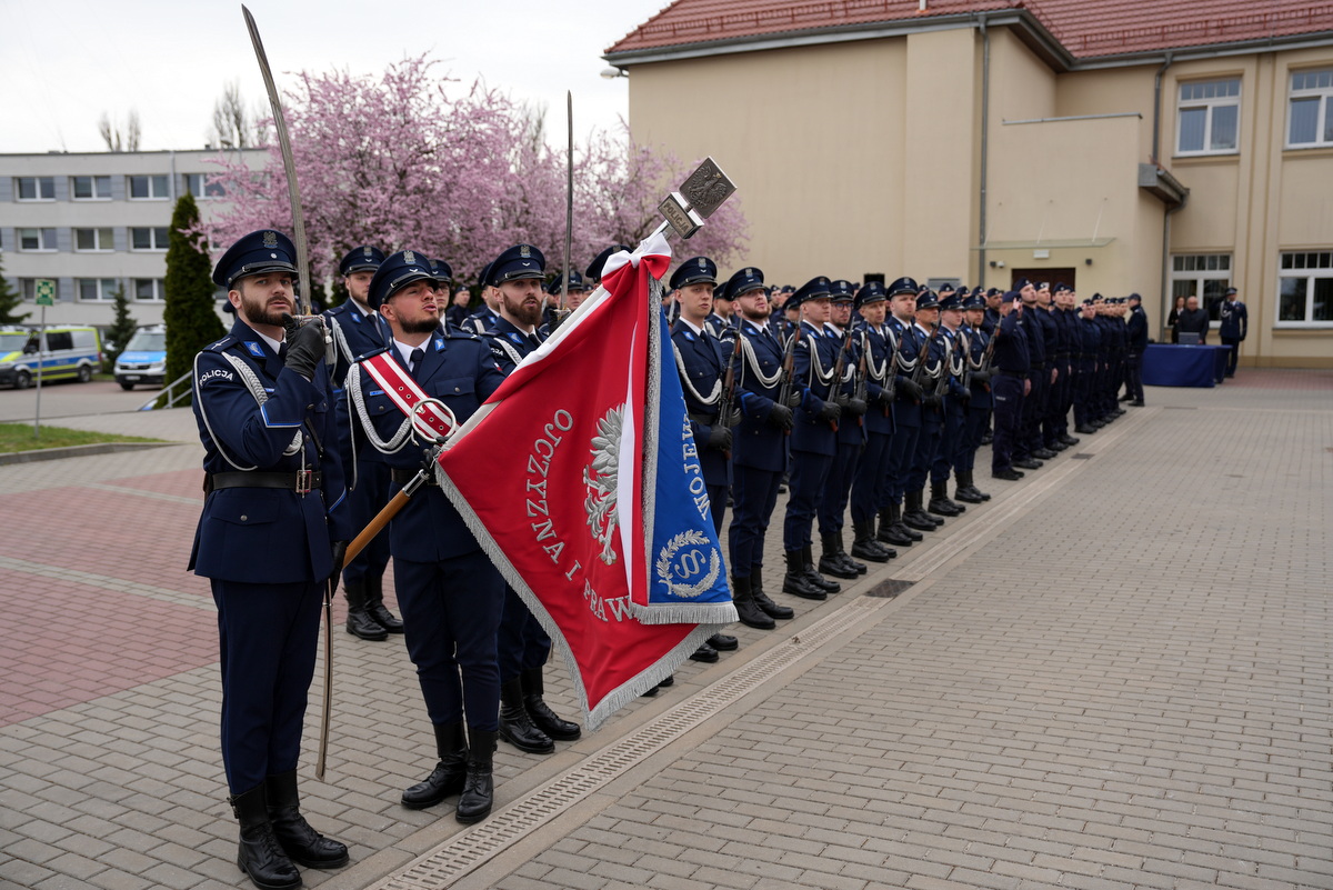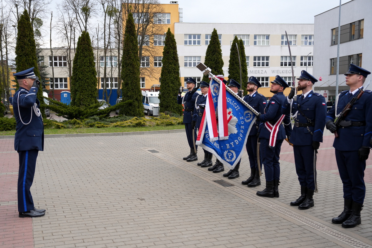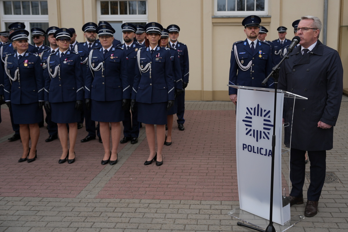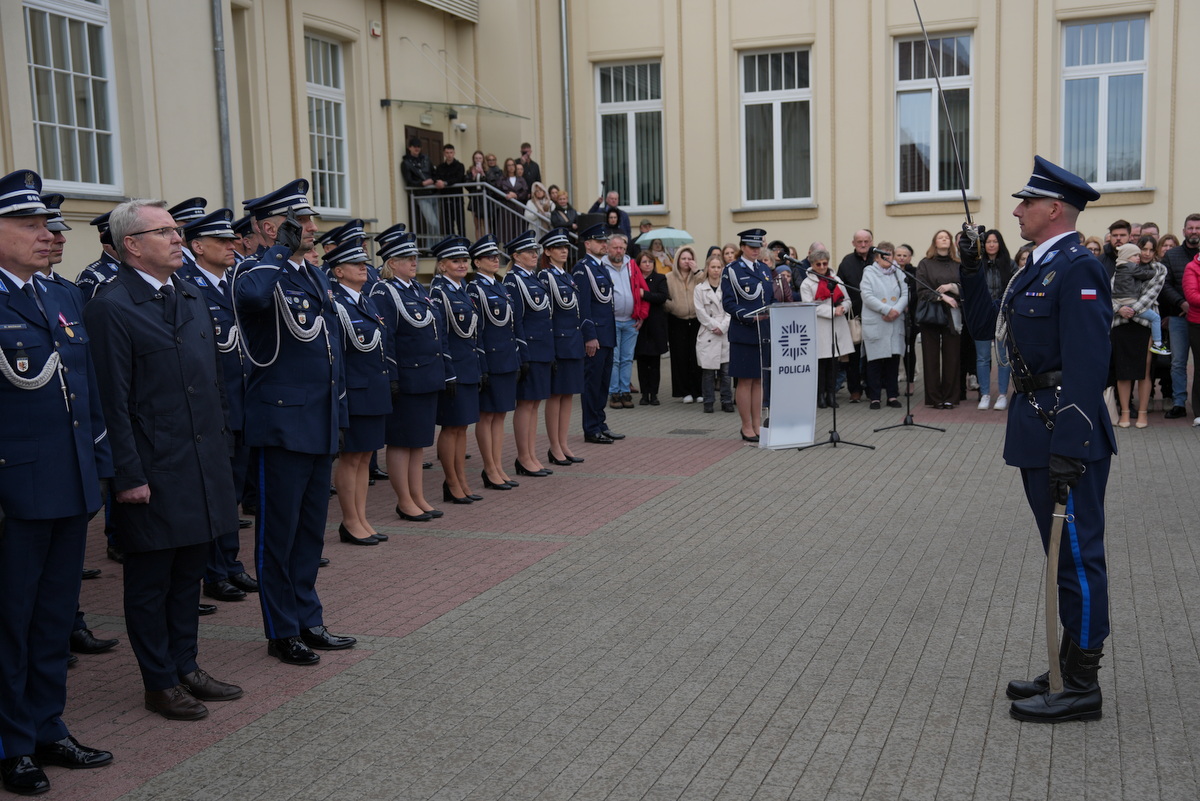 - Dzisiejsza uroczystość ma dla nas szczególne znaczenie. Jest to pierwsze w tym roku przyjęcie do służby w szeregi kujawsko-pomorskiej Policji nowych policjantów. Służba w Policji to nie tylko zawód – to przede wszystkim zobowiązanie wobec Ojczyzny, ale także drugiego człowieka. To gotowość do niesienia pomocy, często w sytuacjach trudnych, wymagających odwagi i poświęcenia. To również codzienna troska o bezpieczeństwo obywateli, dbałość o porządek publiczny – wartości fundamentalne dla prawidłowego funkcjonowania państwa. Wasza obecność tutaj jest dowodem na to, że nie brakuje ludzi, którzy chcą podejmować się tych wyzwań i służyć społeczeństwu.(…)  Słowa podziękowania kieruję również do Waszych rodziców i bliskich. To dzięki wychowaniu, przekazanym wartościom i wsparciu, jesteście dziś gotowi podjąć się tej wymagającej służby. Wychowanie w duchu patriotyzmu, szacunku do drugiego człowieka i odpowiedzialności za wspólne dobro ma dziś swoje piękne odzwierciedlenie.(…) Na zakończenie życzę Wam, abyście zawsze pamiętali, jak ważną misję realizujecie. Niech służba w Policji będzie dla Was źródłem dumy i satysfakcji, a także motywacją do nieustannego rozwoju i samodoskonalenia. Gratuluję Wam wyboru tej drogi. Życzę powodzenia i bezpiecznej służby.