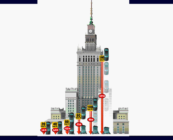 Przekroczenie dozwolonej prędkości związane jest, w przypadku zderzenia z jakąkolwiek przeszkodą, z określonymi skutkami uderzenia, które porównać można do upadku z określonej wysokości.