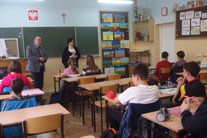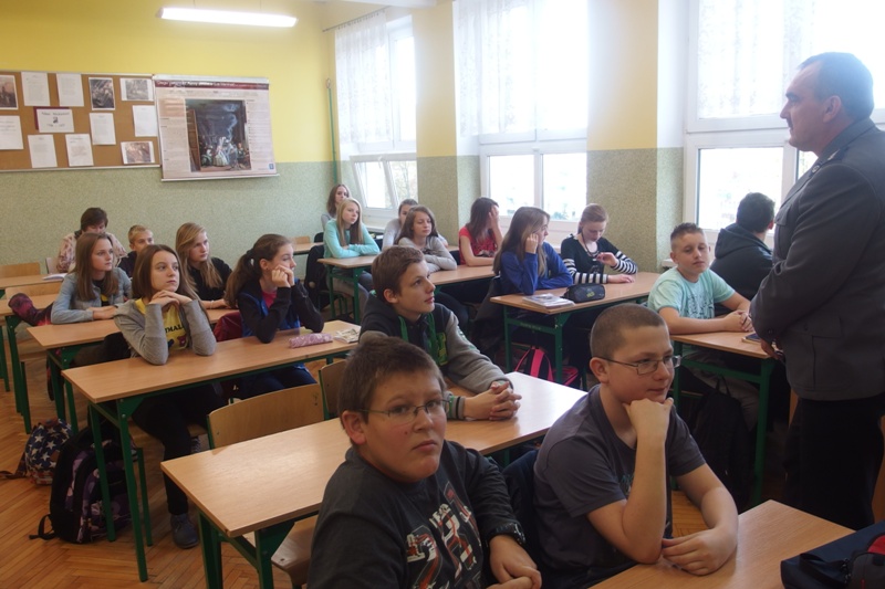 młodym wieku mogą bowiem skutkować na przyszłość i pokrzyżować życiowe plany. Podczas spotkania były także rozmowy na temat narkotyków, dopalaczy, alkoholu i papierosów. Młodzież dowiedziała się również, co oznacza, że nauczyciel w myśl prawa, jest funkcjonariuszem publicznym.st. asp. Izabella Drobniecka